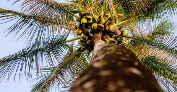 Esse parquinho tem pelo menos 12 coqueiros carregados, cada um com quase 10 metros de altura.