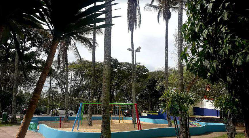 A calçada é gigante, em um local nobre da cidade. Os brinquedos estão em dia, areia limpa, grama cortada.